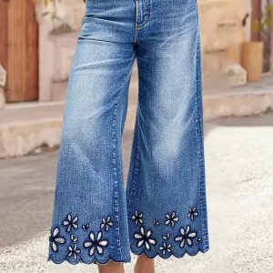 Ladies’ High Waisted Slim Fit Bell Bottom Pants With Floral Embroidery Details, Lightweight And Comfortable Material – Breathable Elastic Denim Wide Leg Pants, The Best Choice For Elegant Fashion And