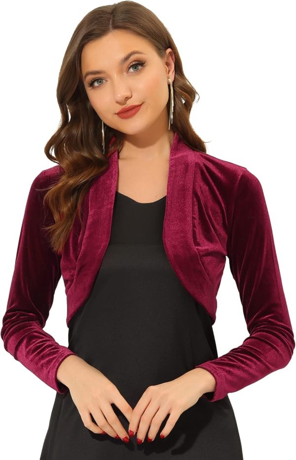 Open Front, Shawl Neck, Pure Color, Full Sleeve, Curved Hem, Velvet Cropped Bolero Shrug
