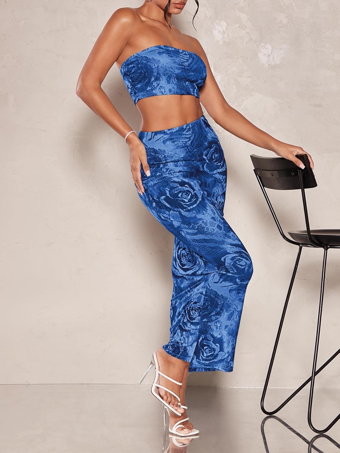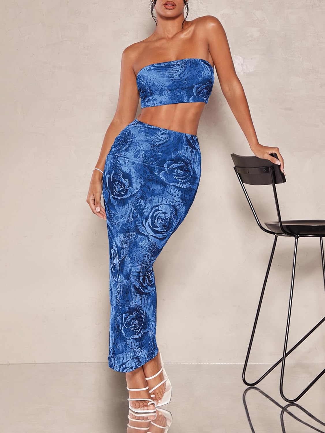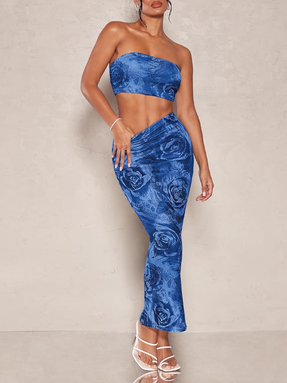 Features: These two piece outfits designed with floral printed, sleeveless, backless, strapless, crop tube top, a line, high waist, slim fit long skirt. Highlight your figure and add your glamour.