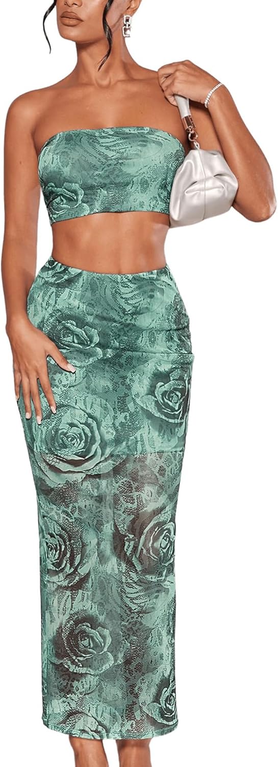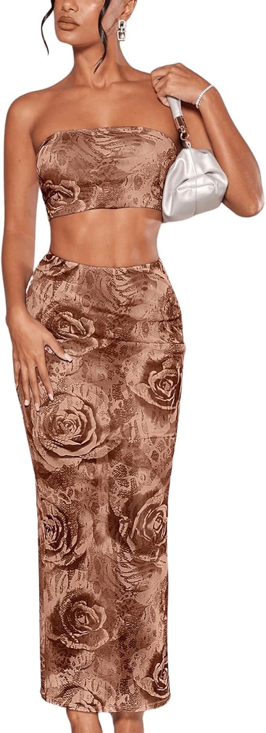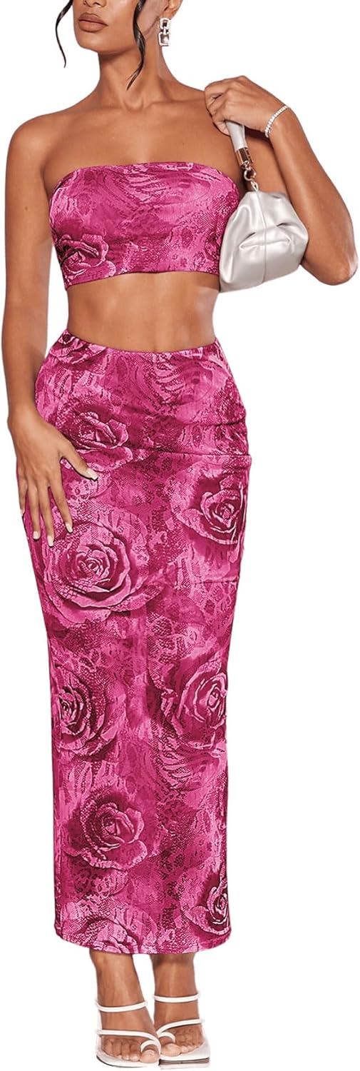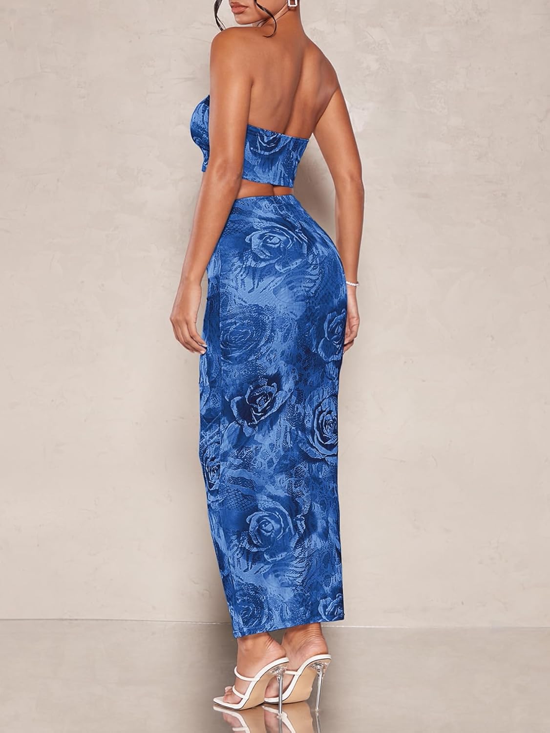 Features: These two piece outfits designed with floral printed, sleeveless, backless, strapless, crop tube top, a line, high waist, slim fit long skirt. Highlight your figure and add your glamour.