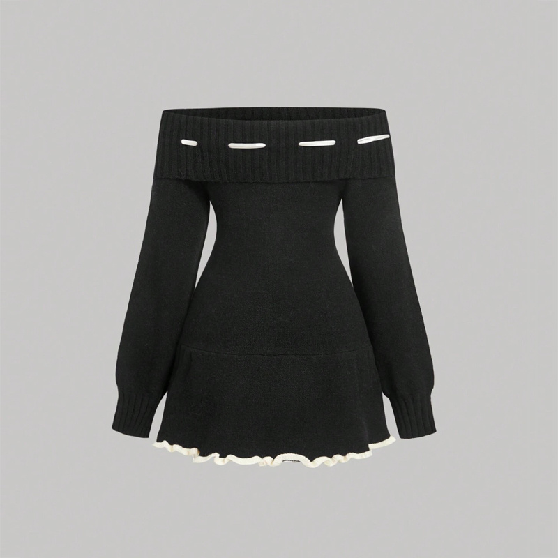Women’s Black Off-Shoulder Knit Dress, Long Sleeve Mini Dress With Lace Trim For Spring & Fall