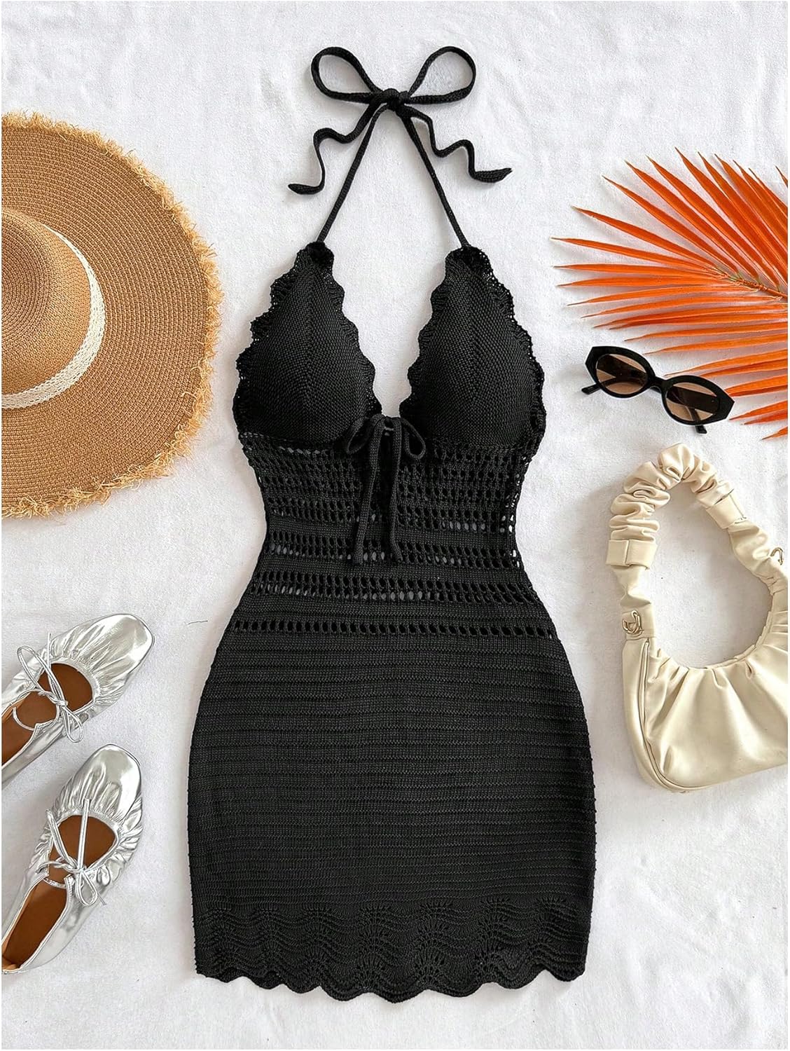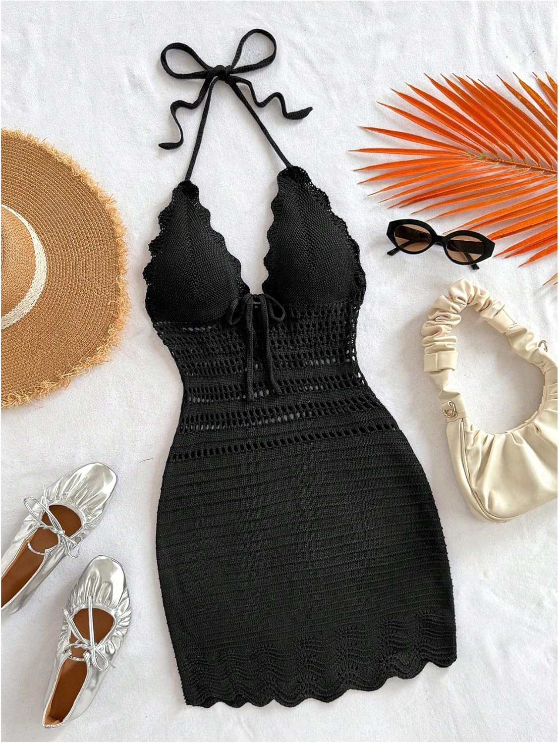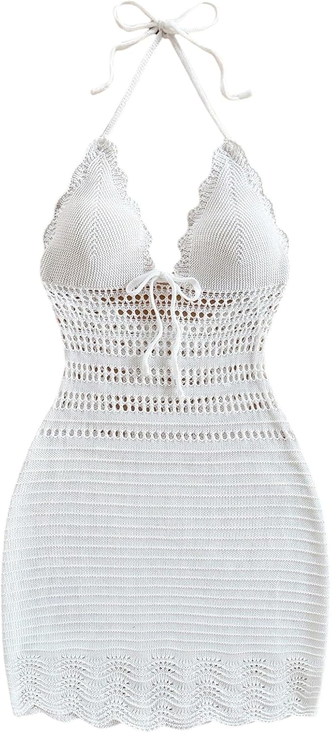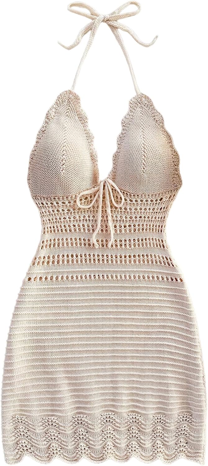 Women's Crochet Halter Mini Dress Bow Backless Bodycon Knit Dresses Summer Festival Outfits